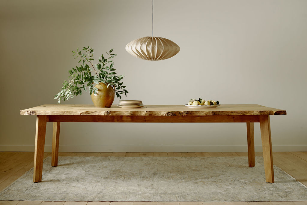 Matbord tillverkat i stavlimmad ek med smala stålben. Bordet är behandlat ljust och tillsammans med underredet så ger det en modern skandinavisk känsla. Bordet mäter 200x90.